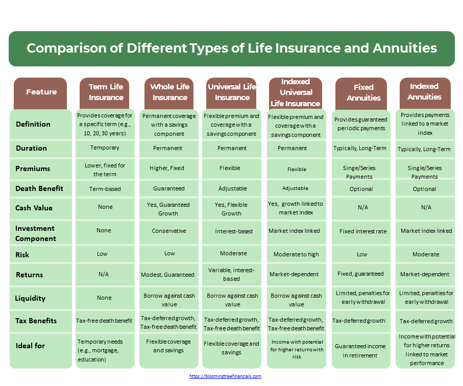 The following table provides a quick glimpse of the major features and differences between the various types of insurance and annuities.